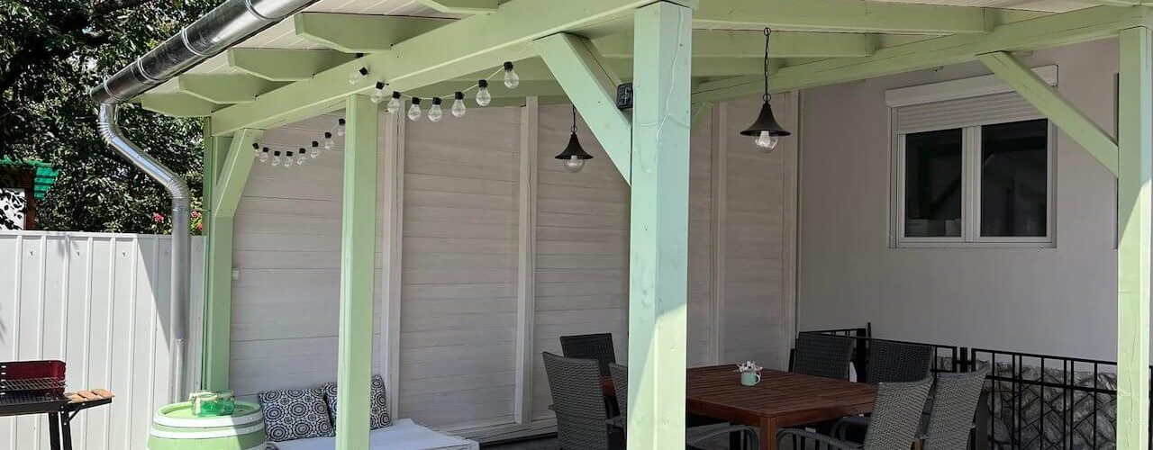 Az udvaron egy nagy fedett terasz, grillezési, bográcsozási lehetöséggel. Fát kérésre biztosítunk